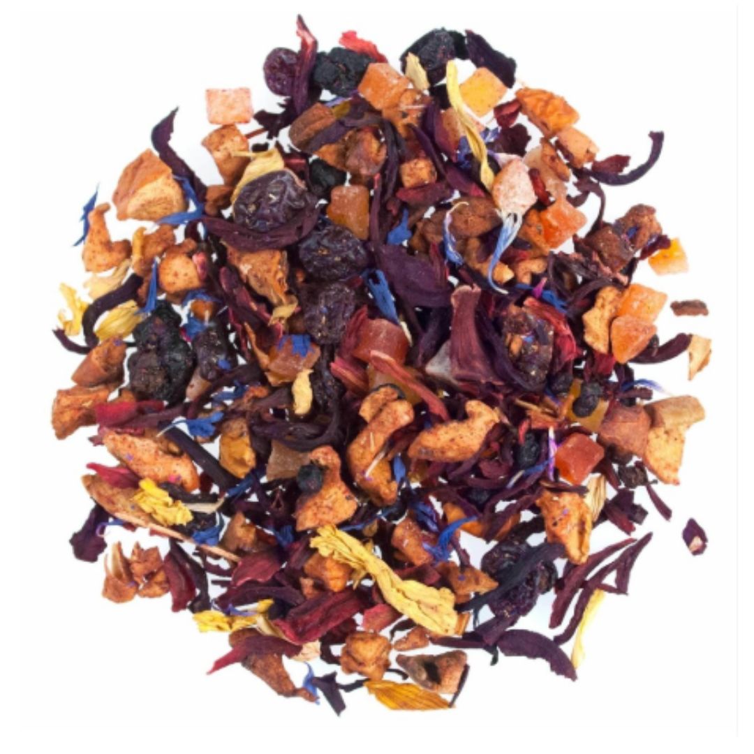 Trozos de manzana, Trozos de papaya, Trozos de grosellas rojas, Trozos de grosellas negras, Trozos de frambuesas, Trozos de fresas, Pétalos de hibiscus, Pétalos de girasol y Pétalos de aciano